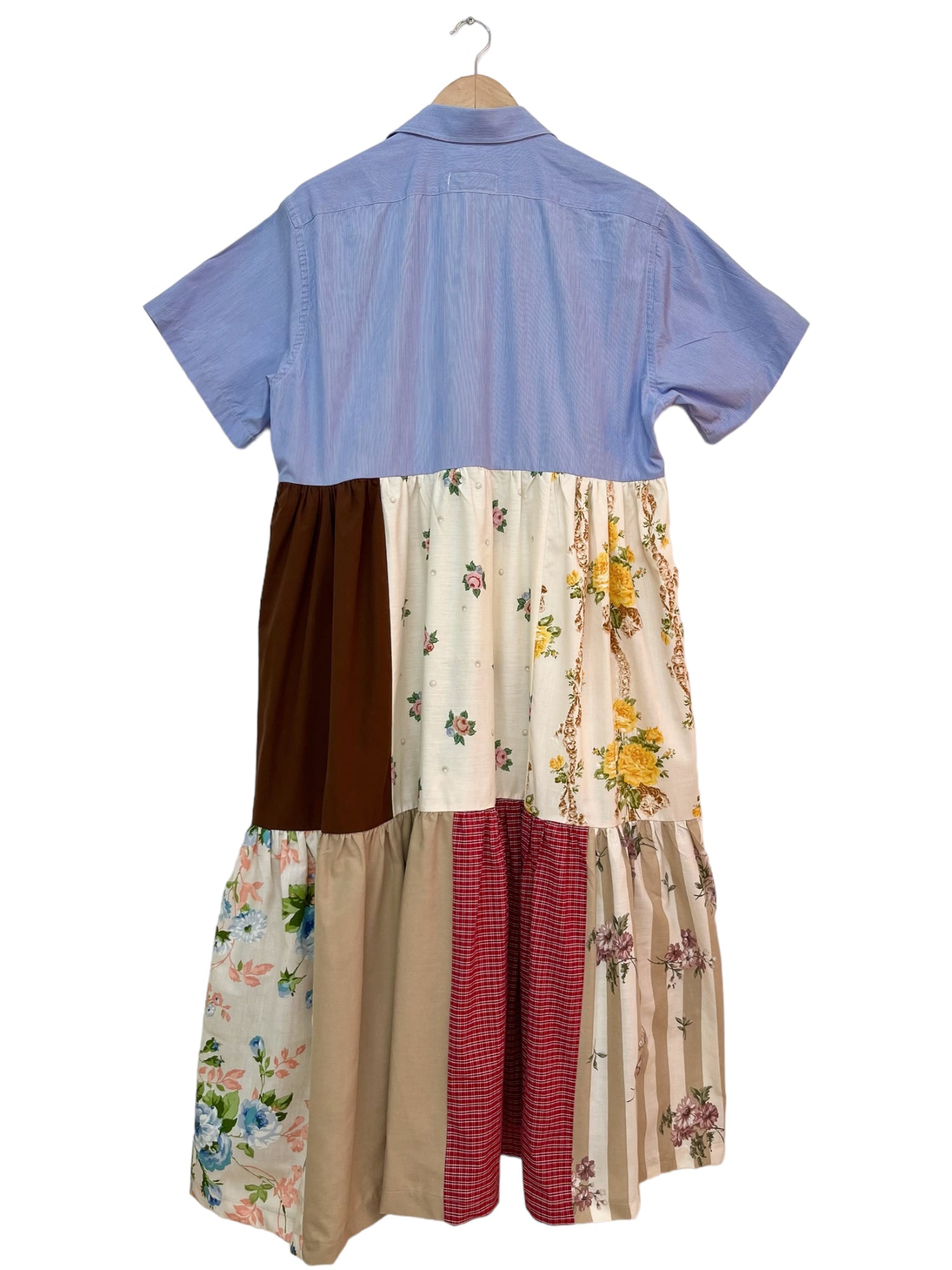 Fabriquée de retailles de tissu agencées méticuleusement afin de mettre en valeur les patterns et les couleurs. Cette robe maxi avec son haut chemise et son fit ample est confortable, stylé et absolument unique.