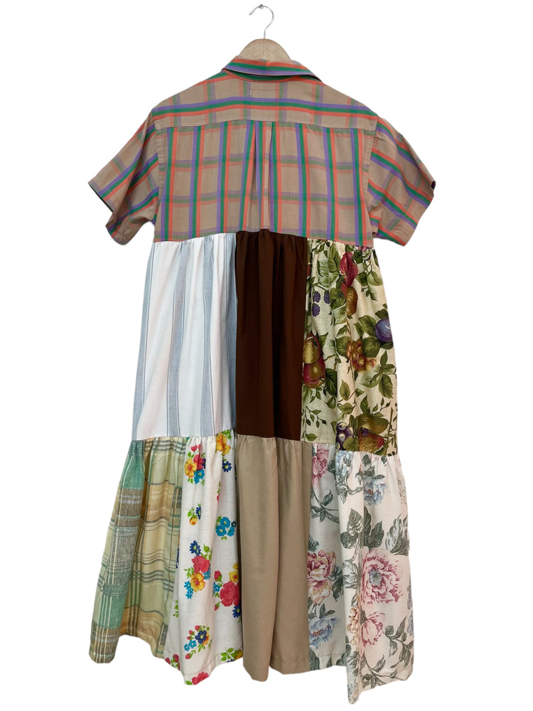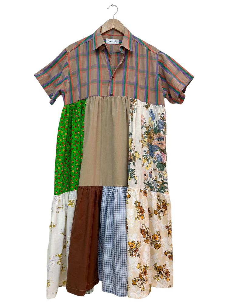 Fabriquée de retailles de tissu agencées méticuleusement afin de mettre en valeur les patterns et les couleurs. Cette robe maxi avec son haut chemise et son fit ample est confortable, stylé et absolument unique.