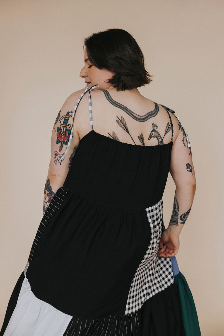 Sa coupe ample et fluide permet une grande liberté de mouvement et un confort maximal, tout en offrant une silhouette flatteuse qui convient à toutes les morphologies. Il suffit d’ajuster les bretelles et de froncer plus ou moins le tissu afin d'obtenir la largeur désirée.