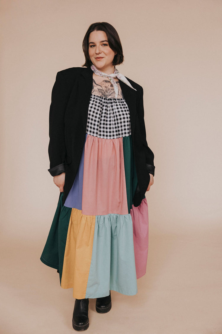 La robe Colorblock N&B est une pièce audacieuse qui se distingue par ses panneaux de couleurs vives et contrastantes. Inspirée par l'art moderne, cette robe offre un style unique et dynamique qui attire l'attention avec son coté coloré et son coté noir & blanc.
