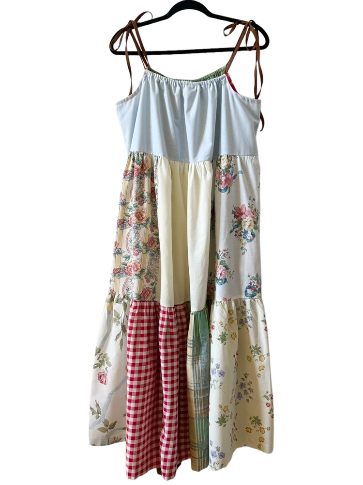 La robe patchwork upcycling est une œuvre d'art textile, composée de différentes pièces provenant de tissu vintage combiné à d'autres matériaux seconde main. Ces morceaux de tissu sont soigneusement sélectionnés et assemblés à la main pour créer un motif patchwork unique qui présente une variété de motifs, de couleurs et de textures.
