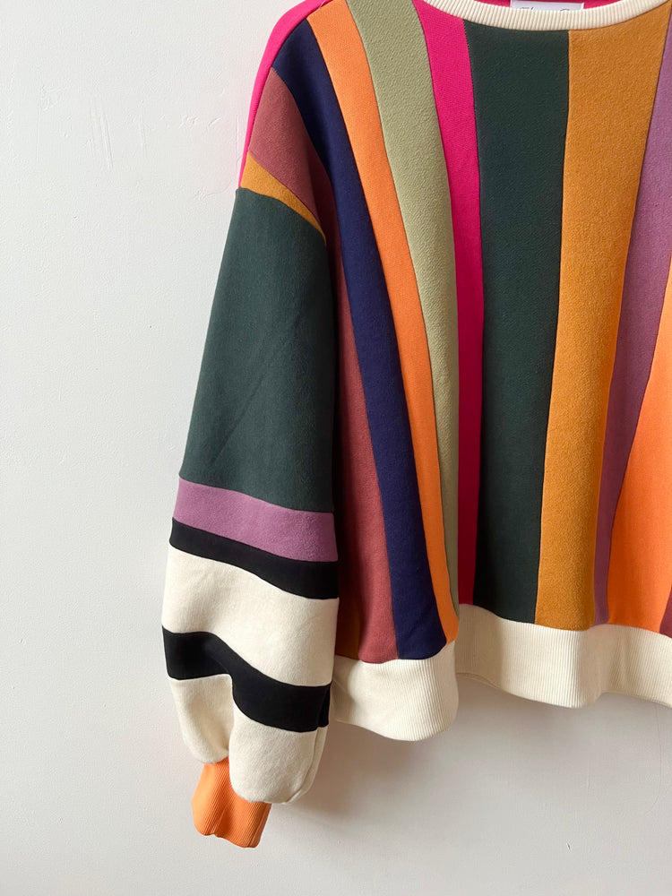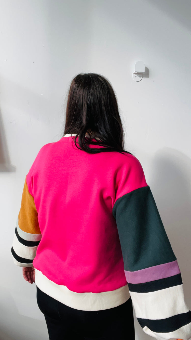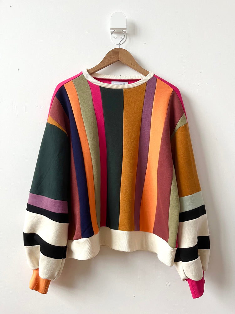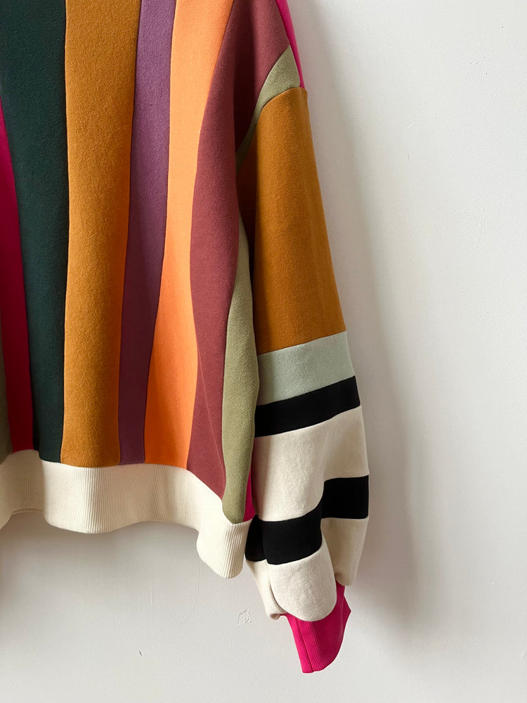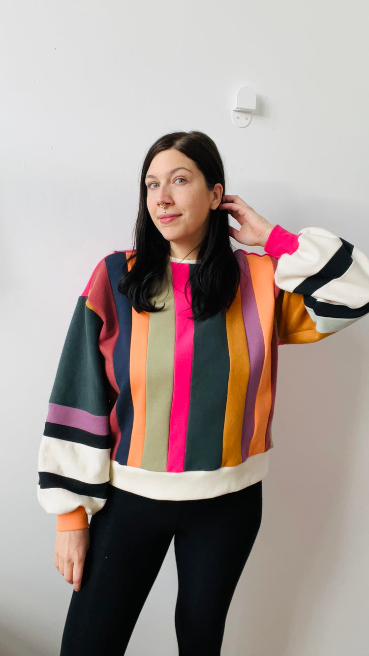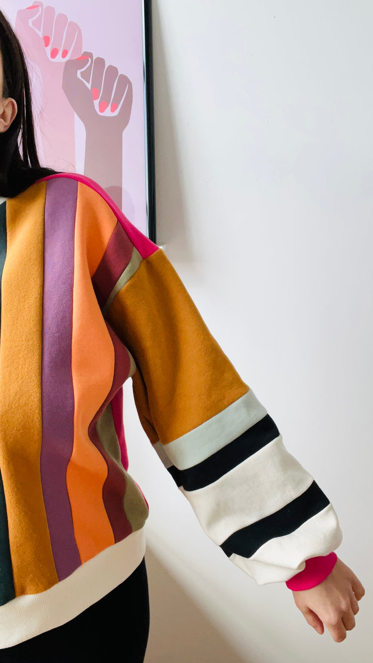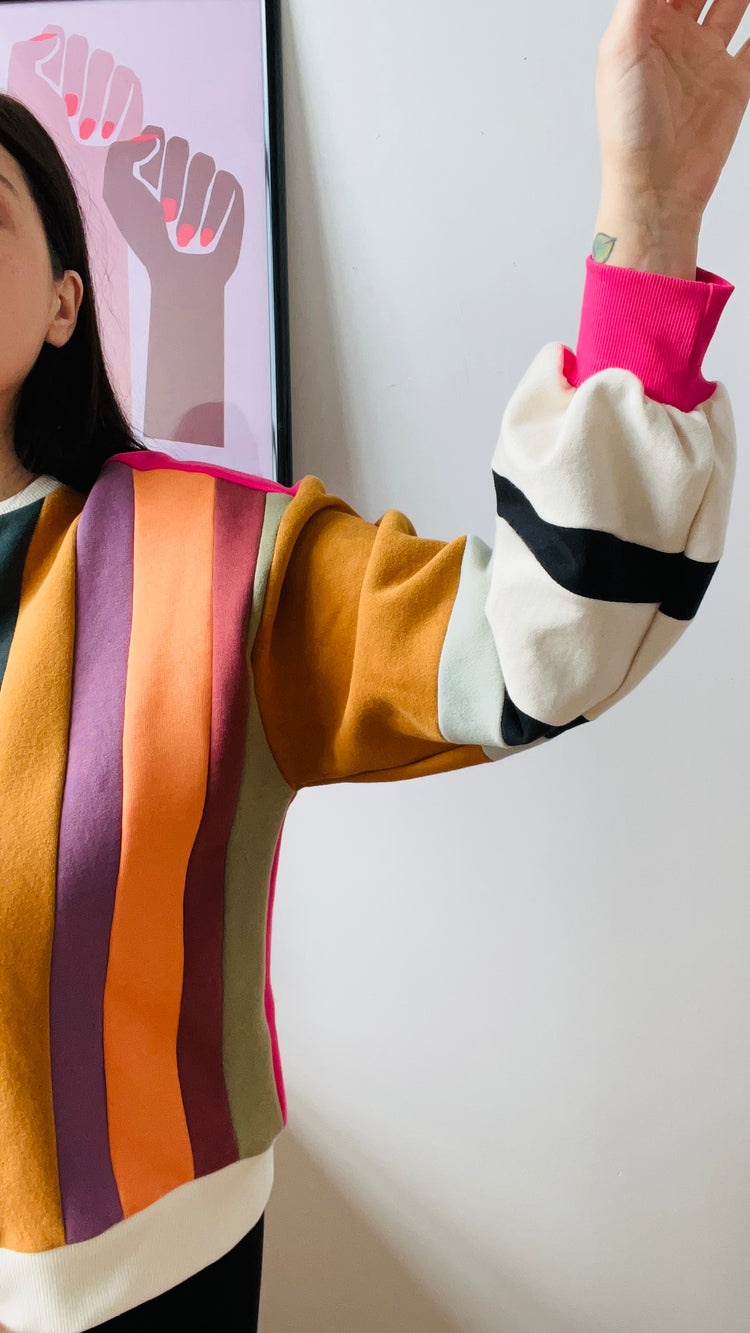 Made from cotton fleece scraps assembled in Colorblock, this sweater with its balloon sleeves and its black and white touch will certainly turn heads. This Colorblock series aims to revalue our own scraps and those of other designers who wish to reduce the quantity of textile destined for the trash. Wearing waste has never been so splendid.