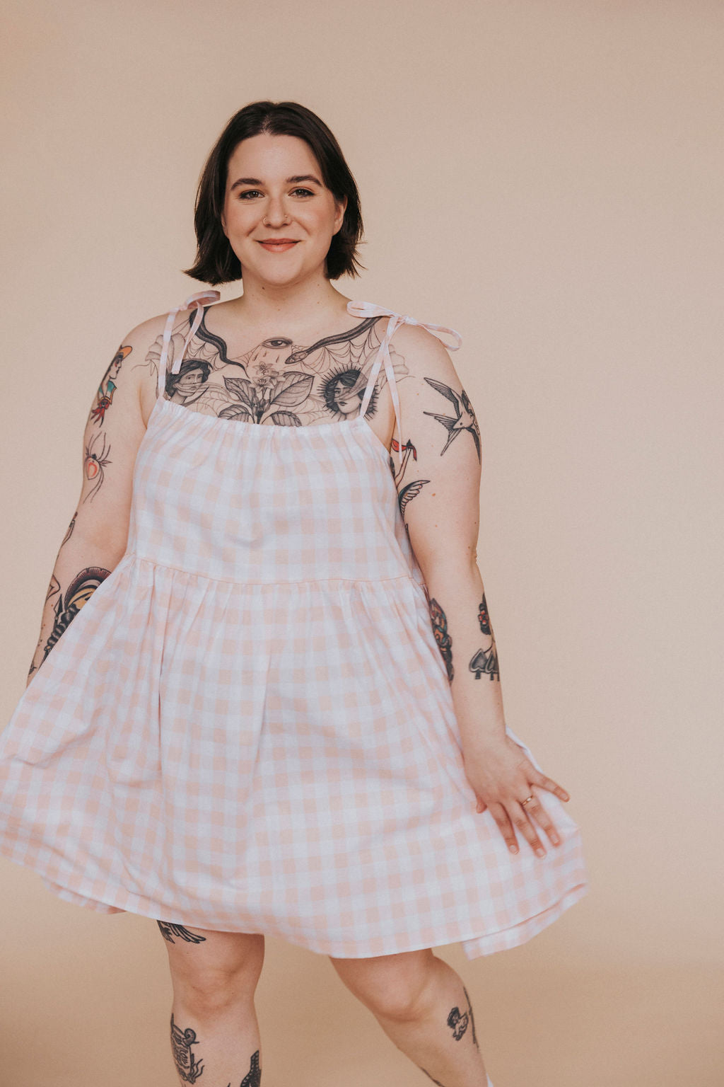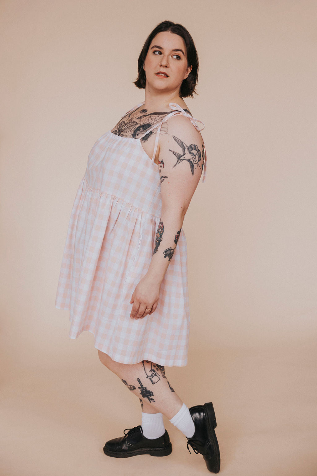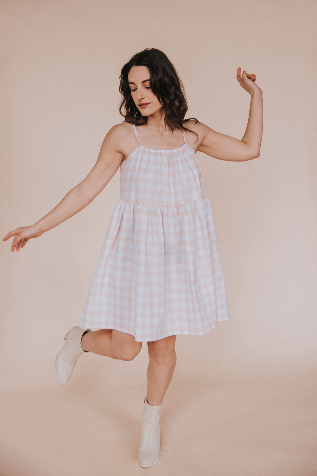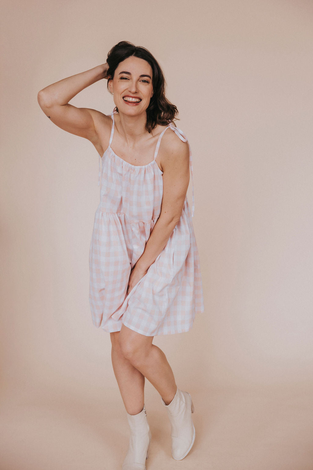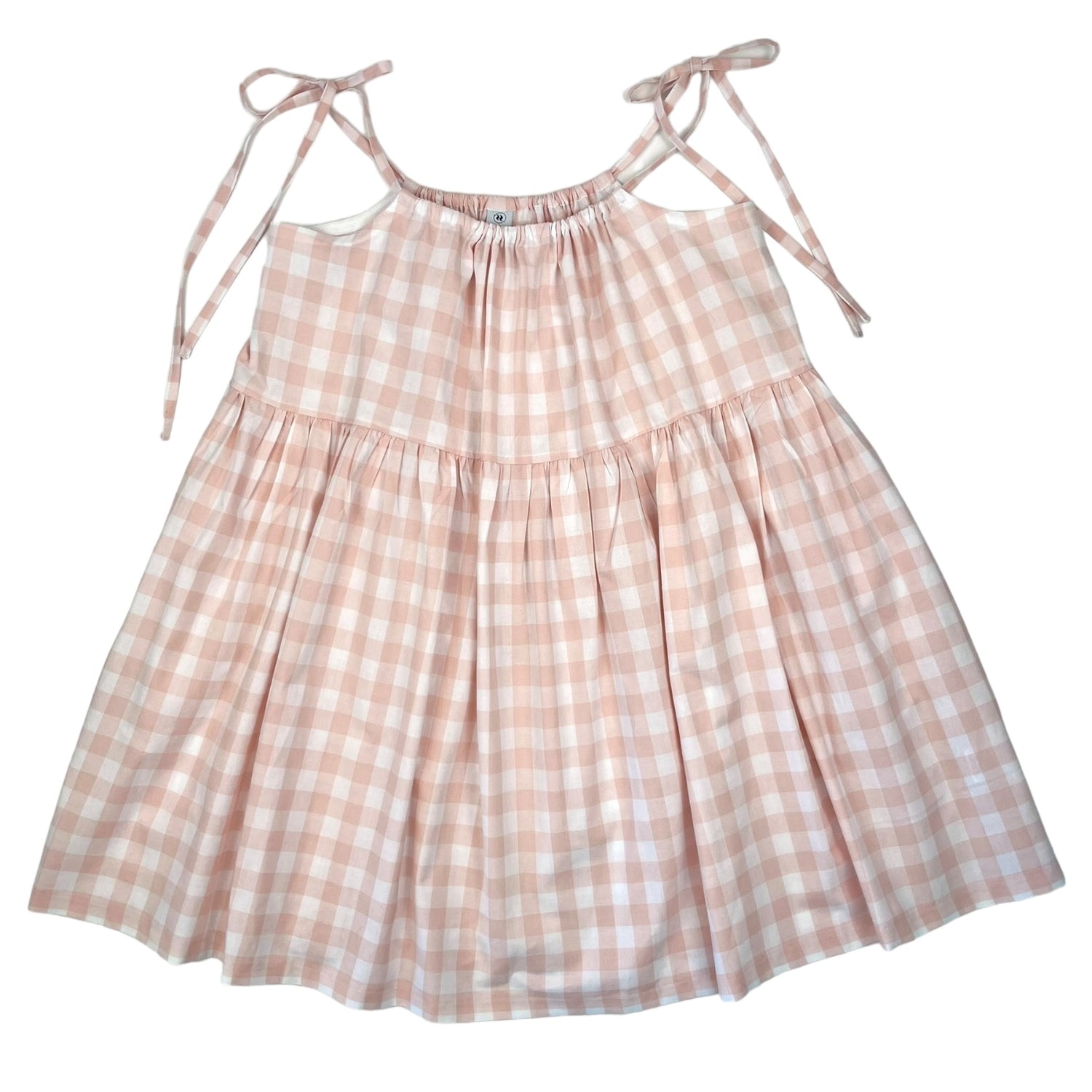 Crafted from lightweight cotton and featuring thin adjustable straps, this babydoll-inspired dress with its flowing, flared cut is an ideal option for a casual look that combines style and comfort. Its classic gingham pattern in pinkish peach tones will add a touch of softness to your summer wardrobe.