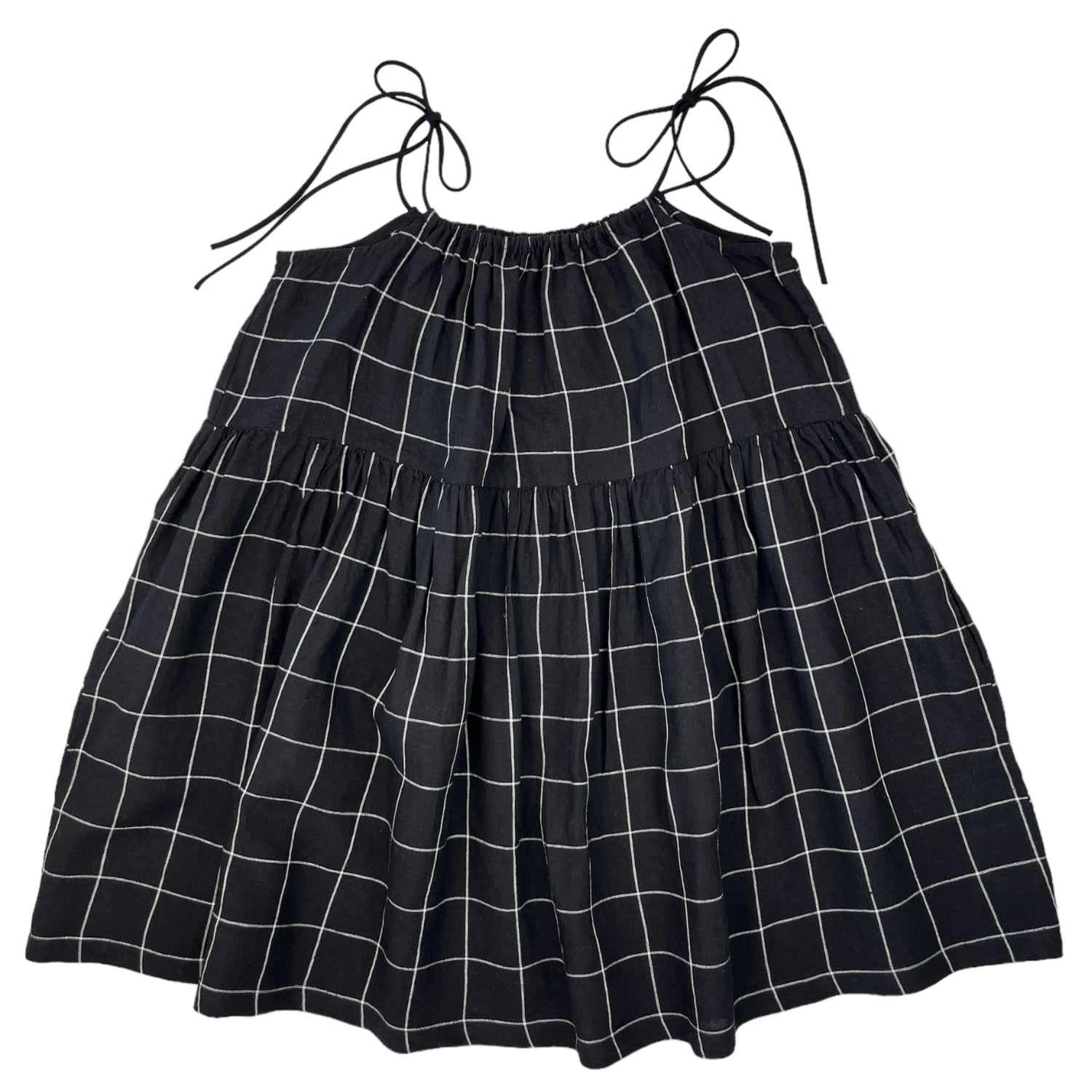 Crafted from lightweight linen and featuring thin adjustable straps, this babydoll-inspired dress with its flowing, flared cut is an ideal option for a casual look that combines style and comfort. This dress will become a favorite among black & white fans with its large contrasting checks.