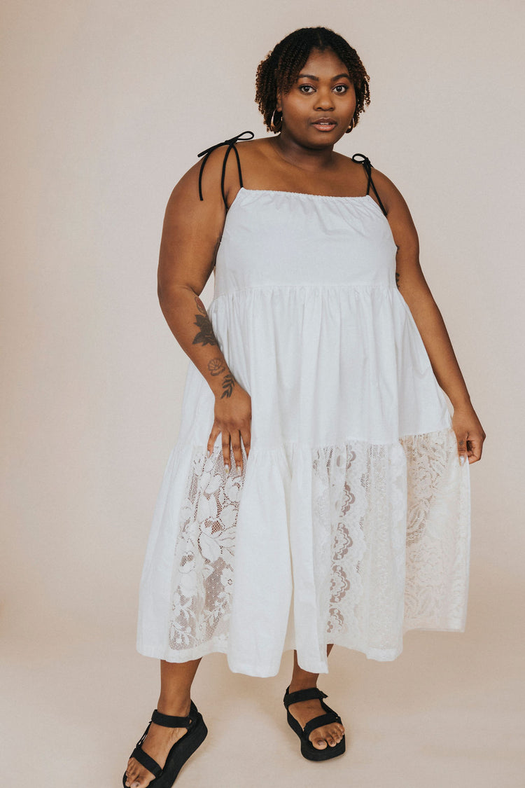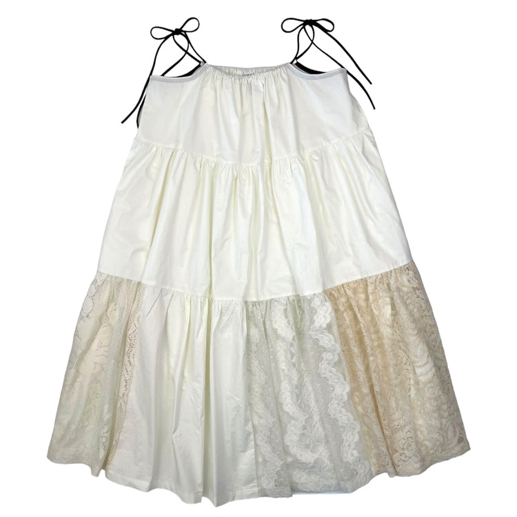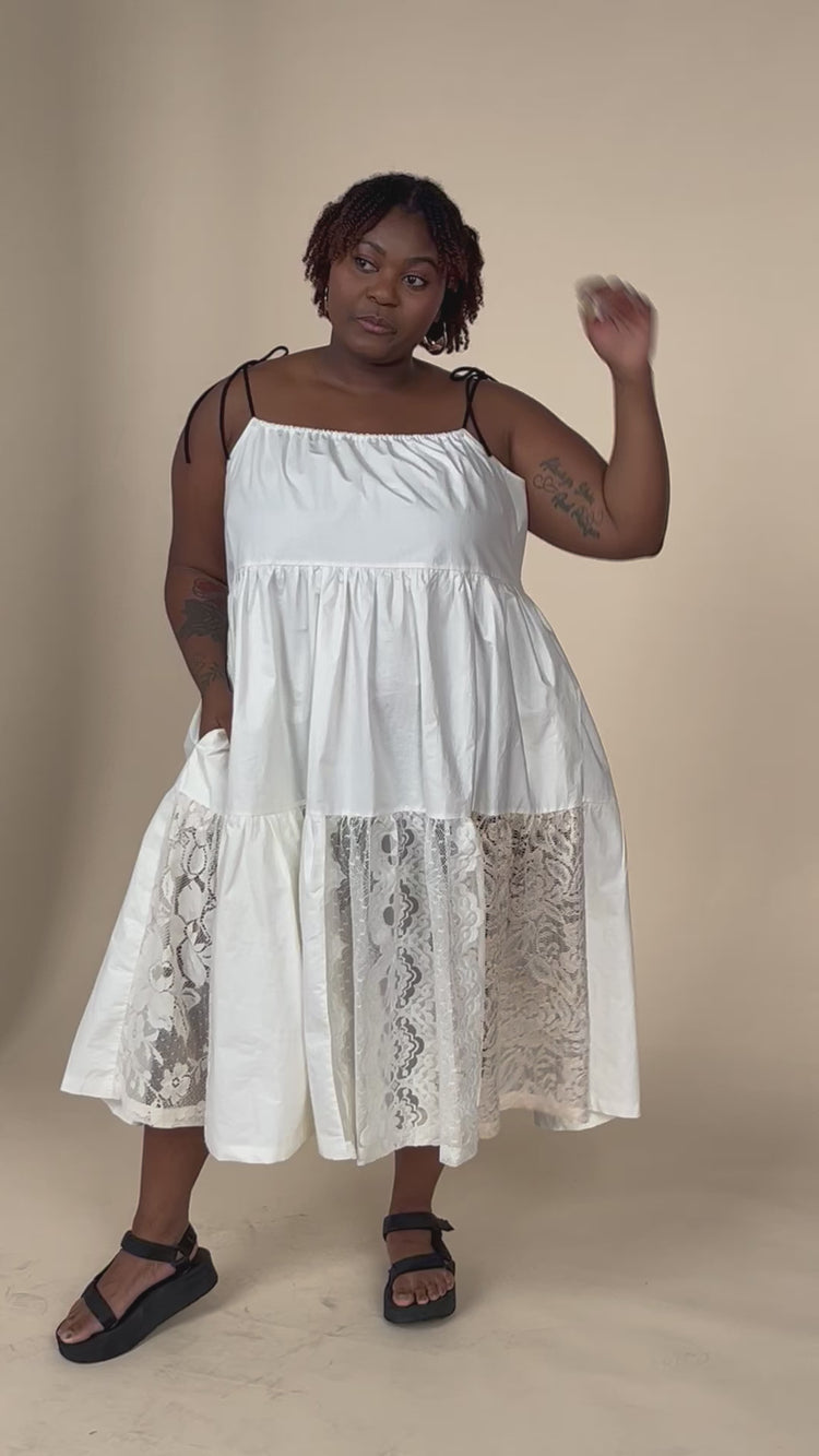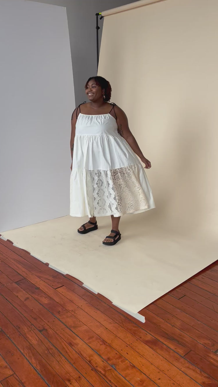 The upcycled cotton and lace dress embodies timeless elegance by combining the comfort of cotton with the refinement of lace. The contrasting black straps give a modern effect to this dress made mainly of "offwhite" cotton and the revalued vintage lace brings a delicate and feminine side.