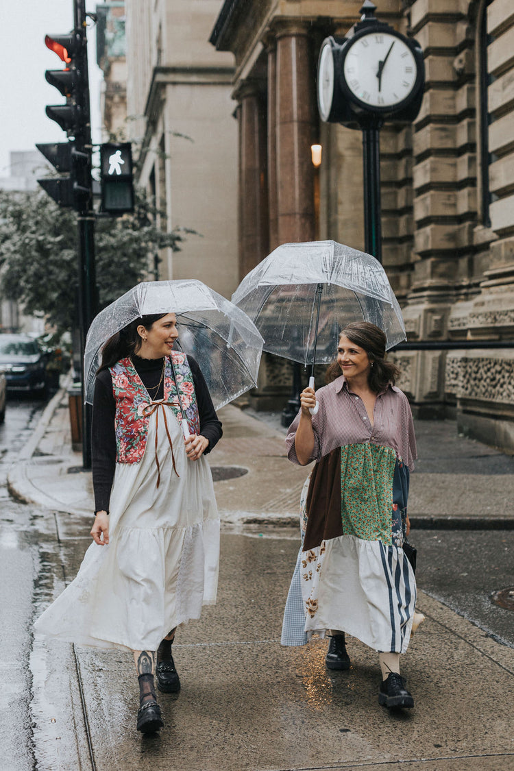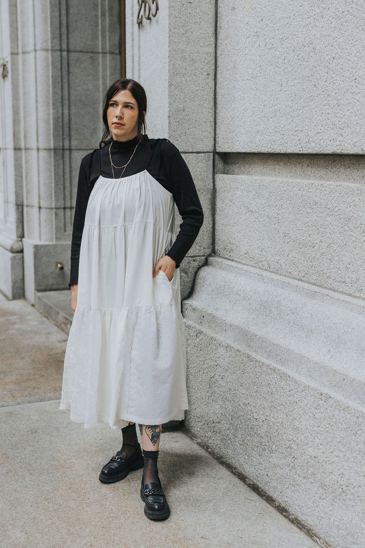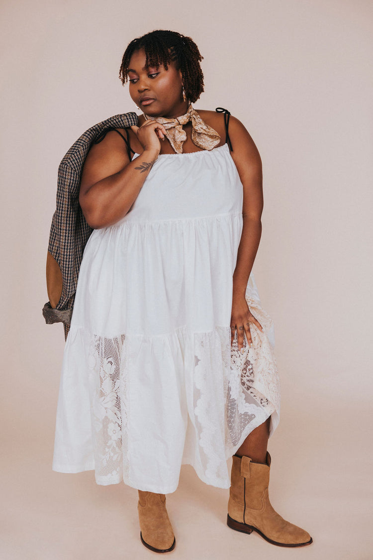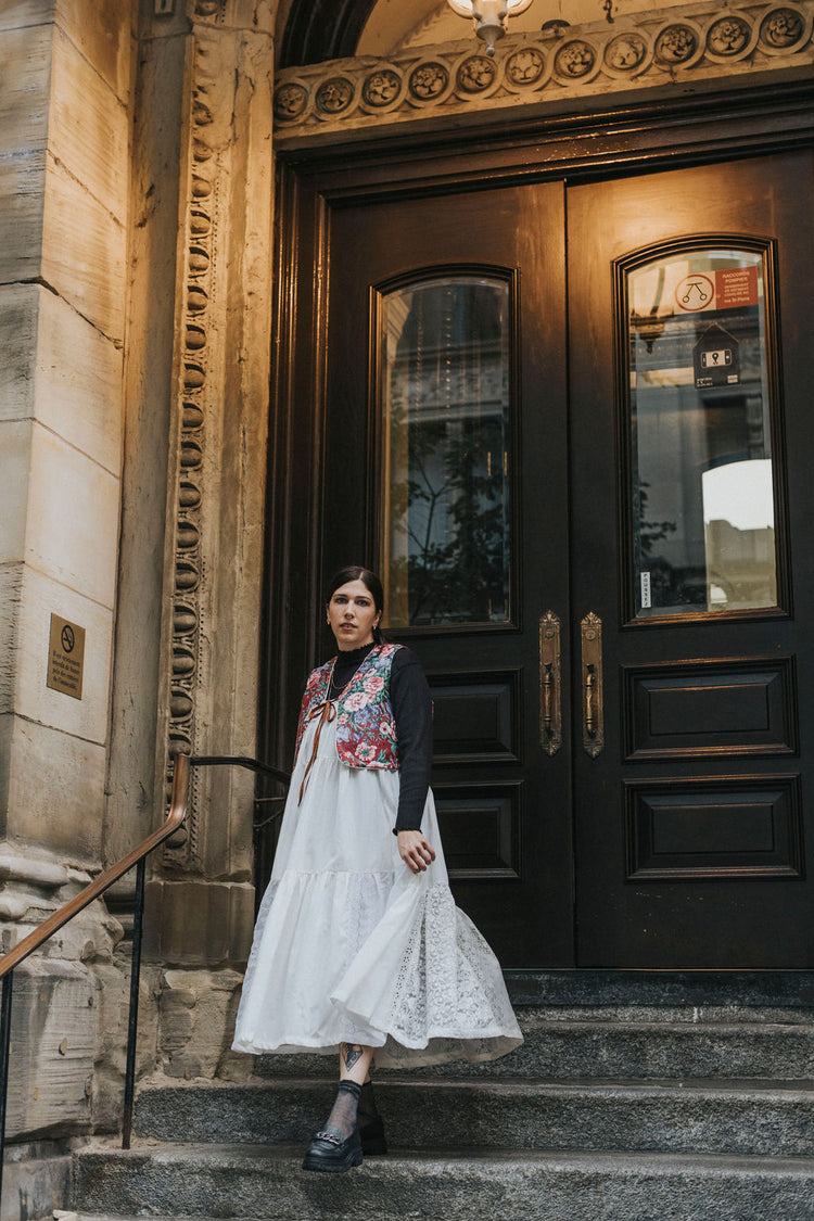 The upcycled cotton and lace dress embodies timeless elegance by combining the comfort of cotton with the refinement of lace. The contrasting black straps give a modern effect to this dress made mainly of "offwhite" cotton and the revalued vintage lace brings a delicate and feminine side.