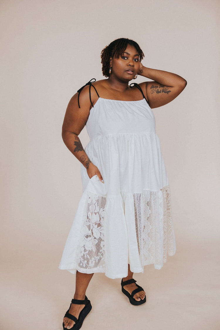 The lace pieces are carefully selected and assembled by hand to create texture and an artisanal charm to this dress that stands out from the rest. Plus, it has pockets!